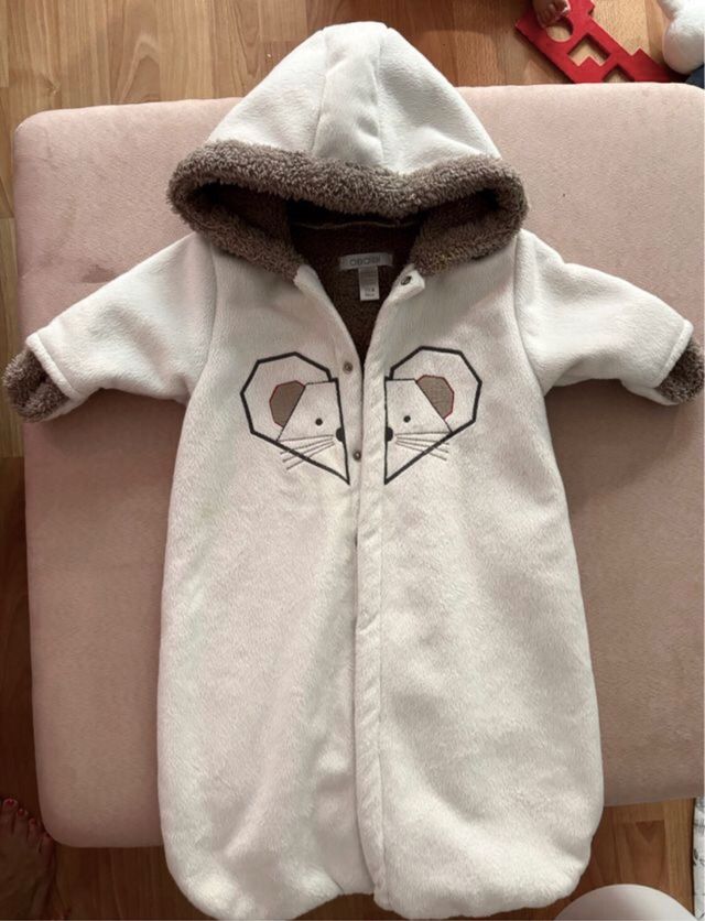 Detalles del productoSaco de bebé con mangas y capucha. Forro de peluche, y material muy suave. Color blanco con un dibujo de ratita. Talla 0-3 meses (60 cm). Fue muy útil para usar en el capazo en los días fríos de invierno o para sujetar al bebé en la silla del coche, ya que las piernas están separadas.