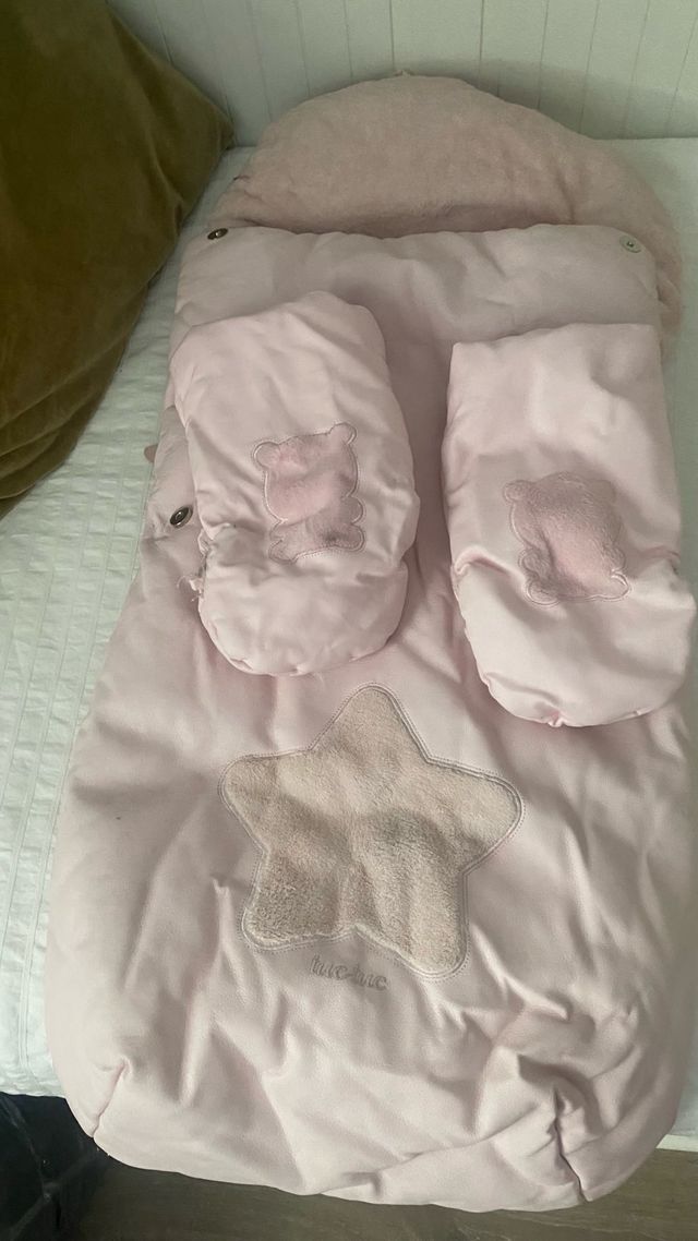 Detalles del productoSaco de invierno y manoplas polipiel para cochecito de bebé en color rosa palo. Presenta un diseño con detalles de ositos y una estrella.