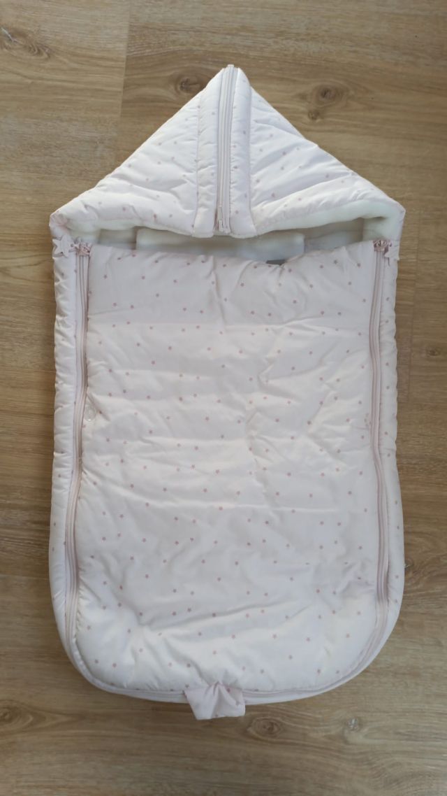 Saco universal para capazo y silla de coche grupo 0. En tono rosa bebé con estrellas. Usado un par de veces. - Diseño con capucha. - Cierre de cremallera.