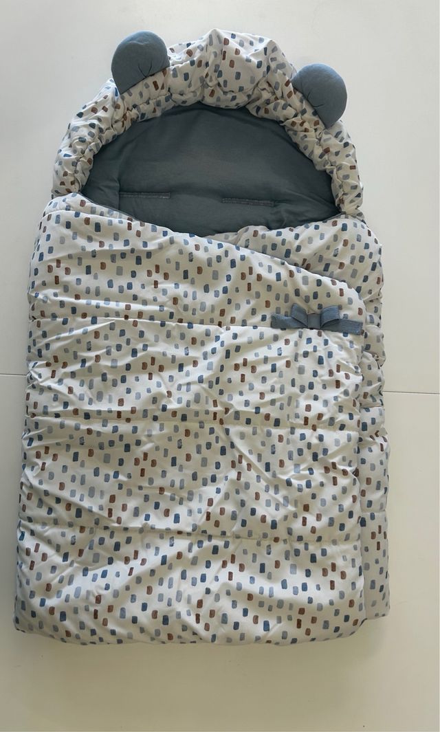 Detalles del productoSaco para capazo de bebé con un bonito estampado de pinceladas en tonos azules y marrones sobre fondo blanco. Incluye detalles como unas orejitas en la capucha y un lazo.