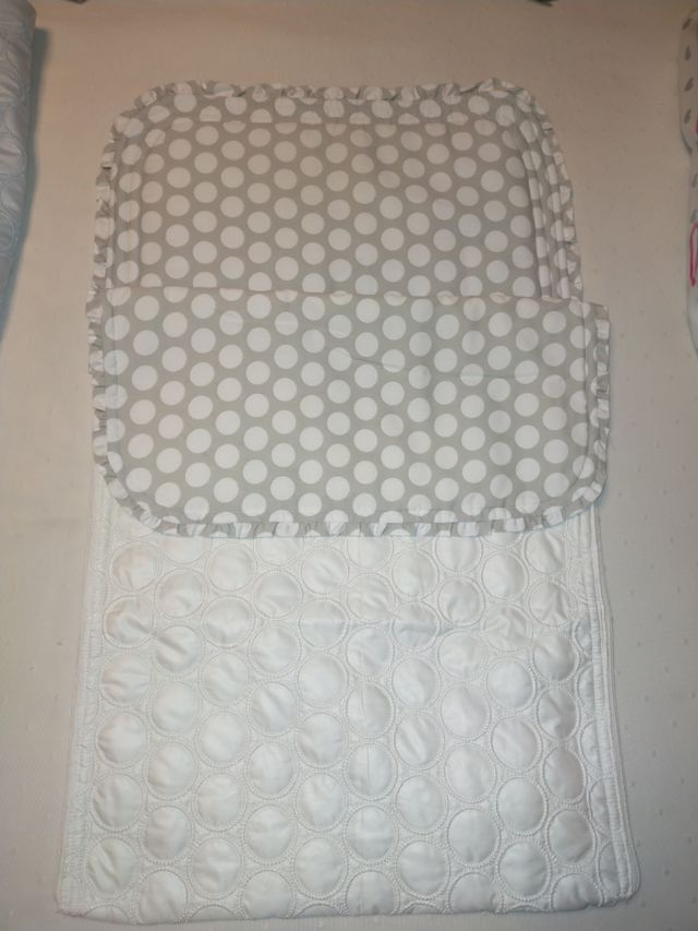 Saco minicuna hecho a mano por modista. La tela gris es piqué. Tiw e cremalleras en los costados para sacar fácilmente al bebé.