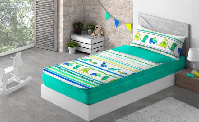 Saco nordico de estampado de Dinosaurios, con su propio relleno que es extraible. Para cama de 90x190. Precio NO negociable! 50% algodón y 50% poliester, el relleno es 100% poliester.