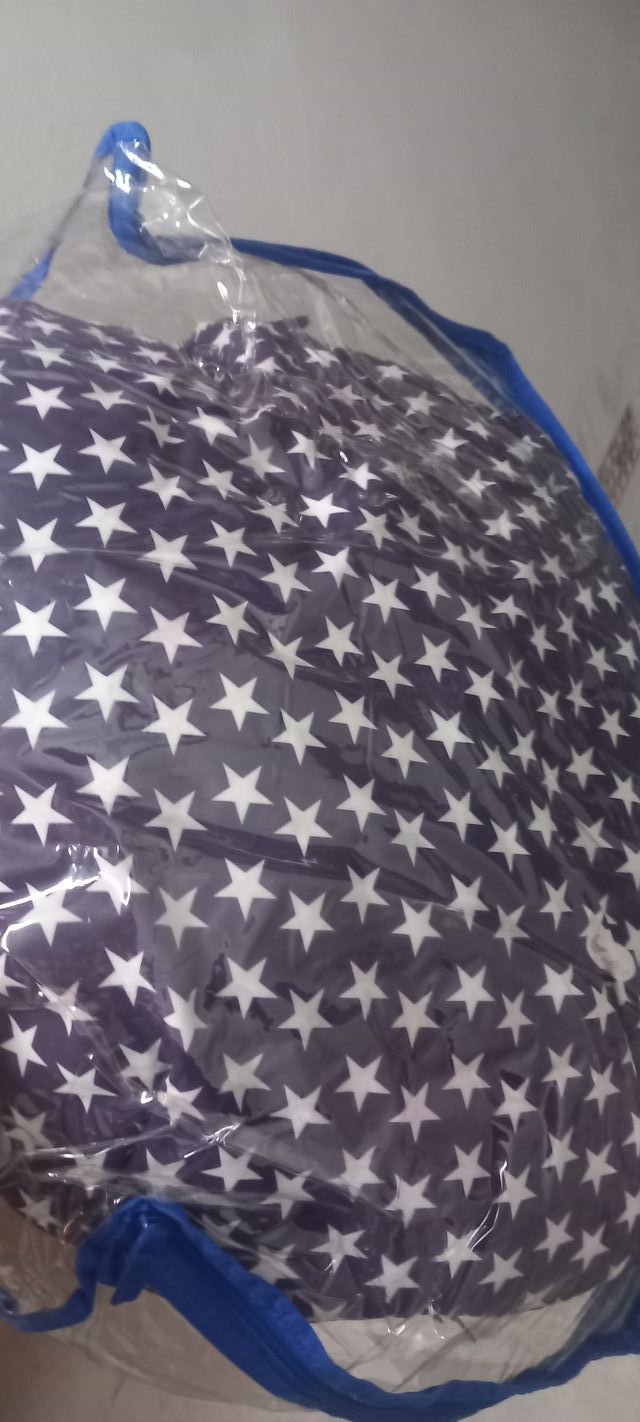 Saco para silla de bebé con un bonito diseño de estrellas. - Estampado de estrellas blancas sobre fondo azul marino. - Incluye asas y cremallera para su cierre.