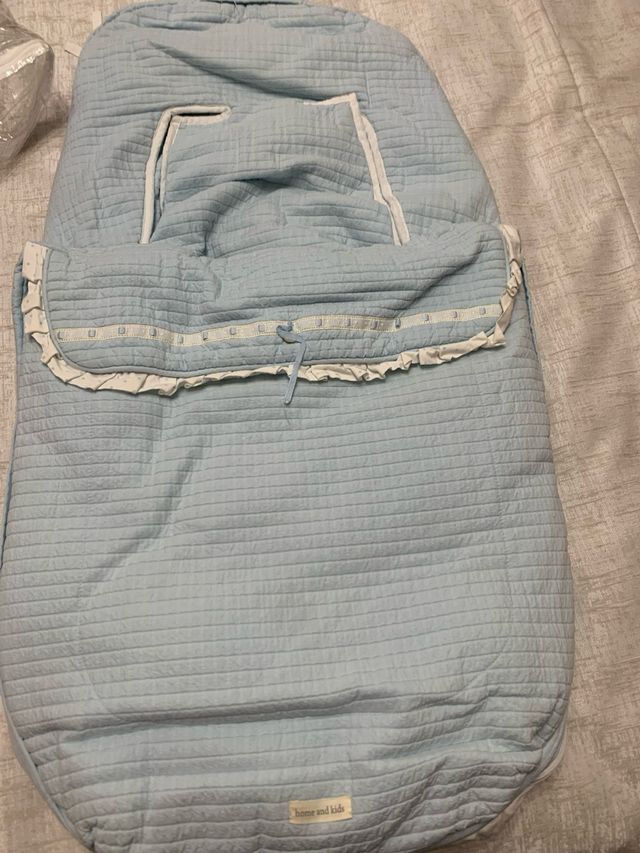 Detalles del productoSaco para silla de paseo de la marca Home & Kids en color azul. Presenta un diseño acolchado con un acabado de canalé fino y detalles de puntilla y cinta.