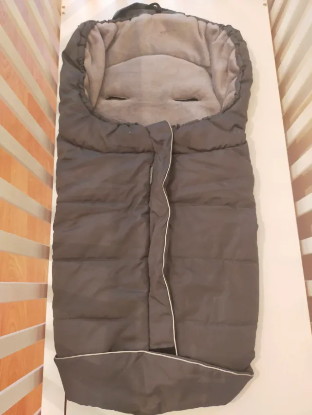 Saco acolchado en color gris para silla de bebé. Es cómodo y cálido. - Exterior de tejido resistente. - Interior suave y confortable. - Diseño con cremallera frontal.