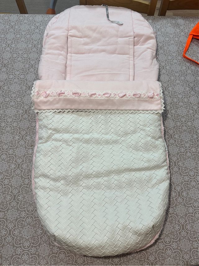 Detalles del productoSaco de silla para invierno, en color rosa y blanco roto. Ideal para abrigar al bebé durante los meses más fríos.