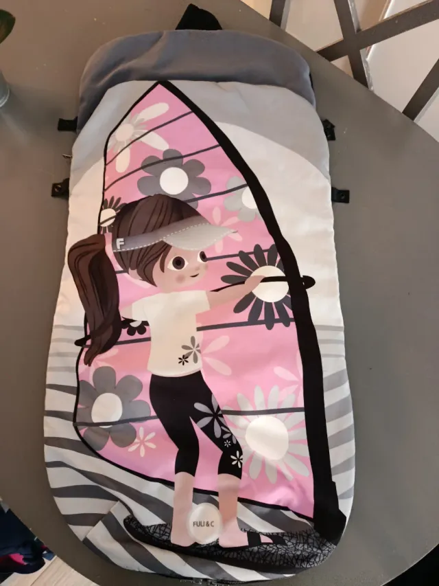 Detalles del productoSaco para silla de bebé, ideal para la primavera. Presenta un diseño alegre con una niña practicando surf.