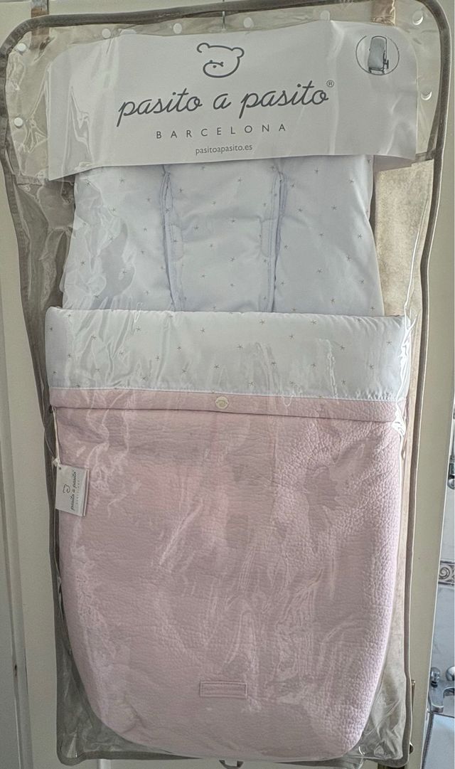 saco de silla de paseo de la marca pasito a pasito,acolchado por dentro blanco y rosa y polipiel rosa.nuevo con etiqueta y en su embalaje original