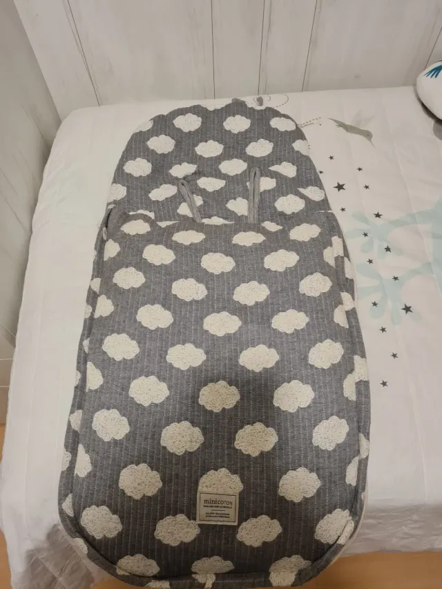 Saco para silla de paseo con un bonito estampado de nubes grises. - Diseño de la marca Minicotton. - Estampado de nubes blancas sobre fondo gris.