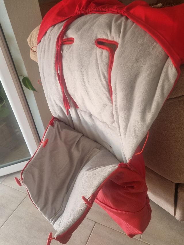Saco para silla de paseo para bebé, color rojo. Está en buen estado. - Tejido exterior rojo. - Interior de borreguillo gris. - Se abrocha con cremalleras.