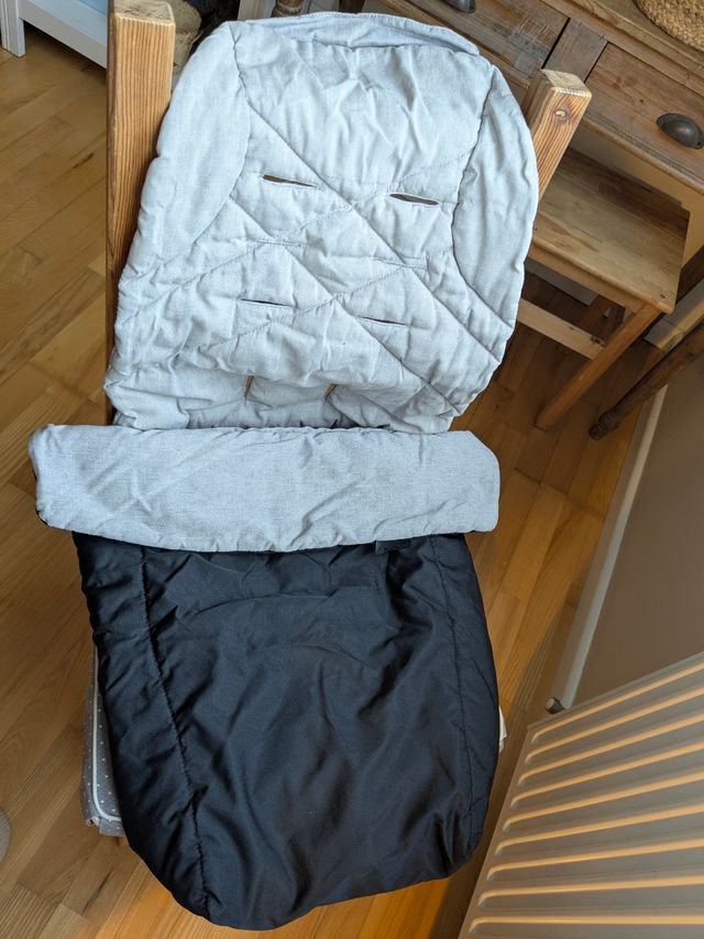 Saco para silla de paseo en tonos gris y negro. Perfecto para mantener al bebé abrigado. - Parte superior acolchada en negro. - Parte inferior en gris.