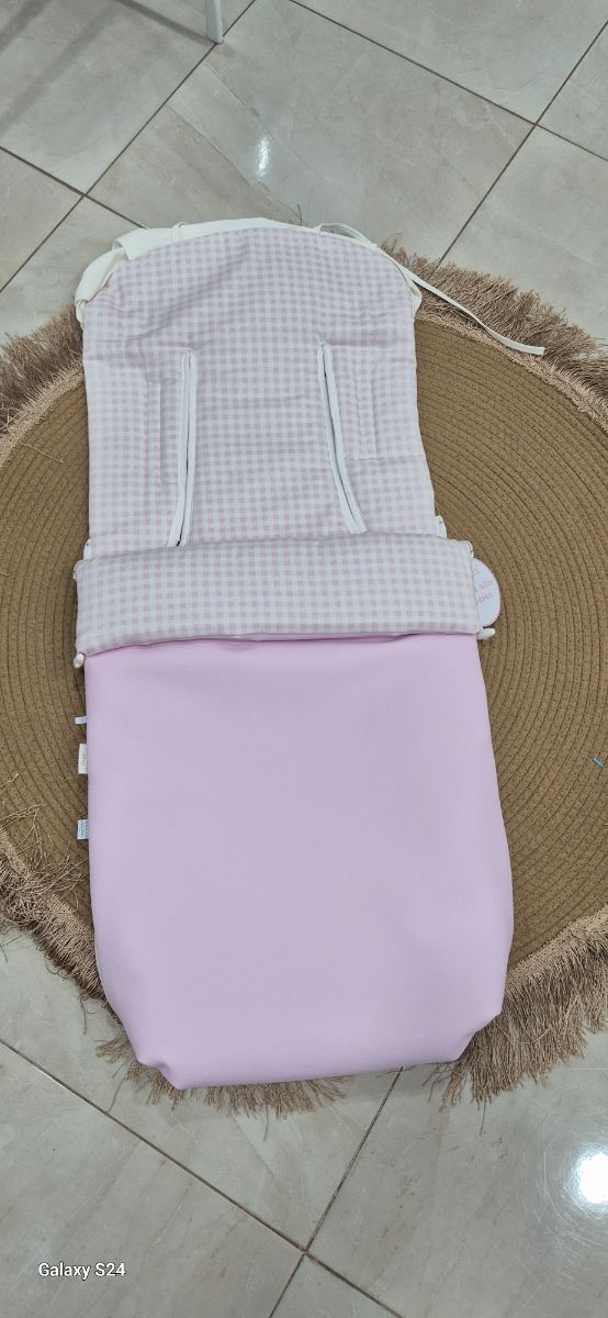 Detalles del productoSaco universal para silla de paseo con un diseño de cuadros vichy en rosa y blanco en la parte superior y un suave tejido rosa en la parte inferior.