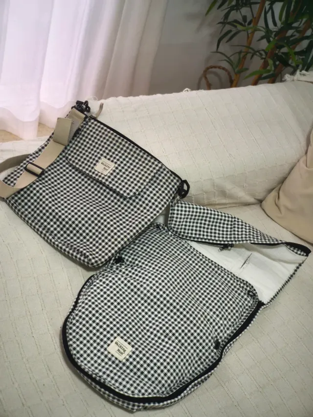 Detalles del productoConjunto de saco y bolso de la marca Walking Mum con un bonito estampado de cuadros.
