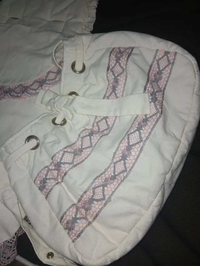 Detalles del productoConjunto de saco y bolso para bebé en color blanco, con detalles de encaje rosa y gris.