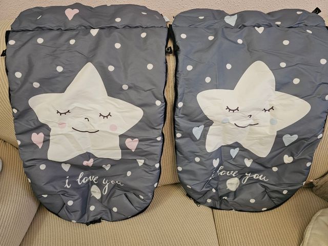 Detalles del productoDos sacos de invierno para silla Mountain Buggy, con un diseño de estrellas y corazones.