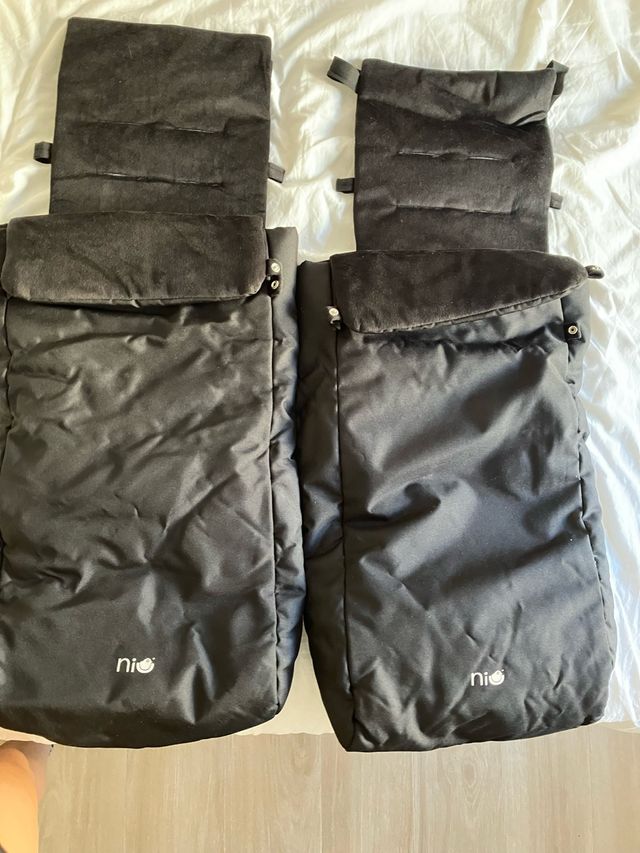 Dos sacos para coche gemelar de la marca Niu. - Color negro. - Diseño acolchado. - Cierre con cremallera. - Logo de la marca visible.