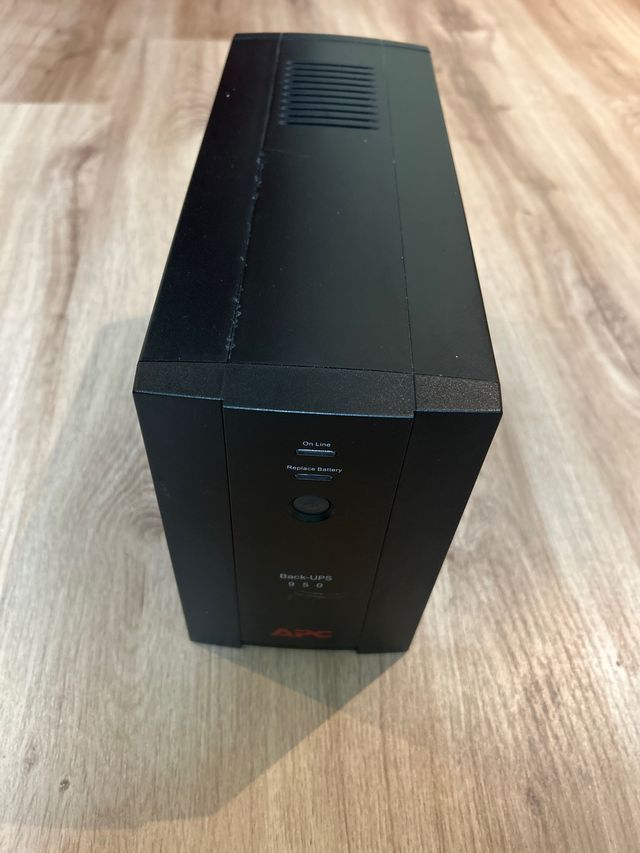 SAI de 950VA con conectores IEC. Funciona correctamente pero la batería está al final de su vida útil. Hay que cambiarla.