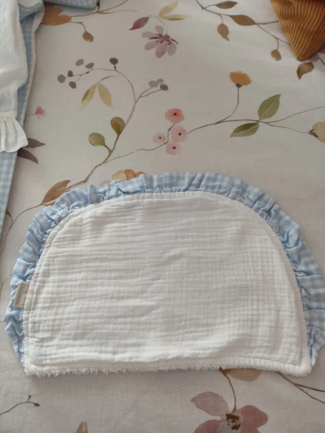 Detalles del productoPreciosa salvababas, de tejido en bambula blanca combinada con volante en Vichy celeste, forrada por detrás como se aprecia en foto en tela de toalla para que no empape. Ideal para ponerla en el capazo del bebe o en la cuna, Está impecable de nueva.