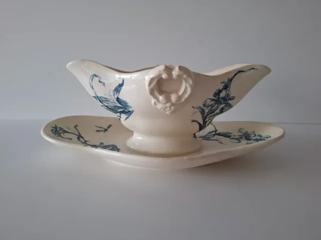 Detalles del productoPreciosa salsera francesa antigua en perfecto estado de conservación, con su plato incorporado. Es de Loza Terre de Fer con sello de la prestigiosa marca DIGOIN SARREGUEMINES, patrón IRIS. El diseño floral azul sobre blanco es típico de la vajilla de época. Es una pieza de alta colección.
