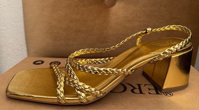 Sandalia dorada Zara, tacón medio, 1 solo uso,