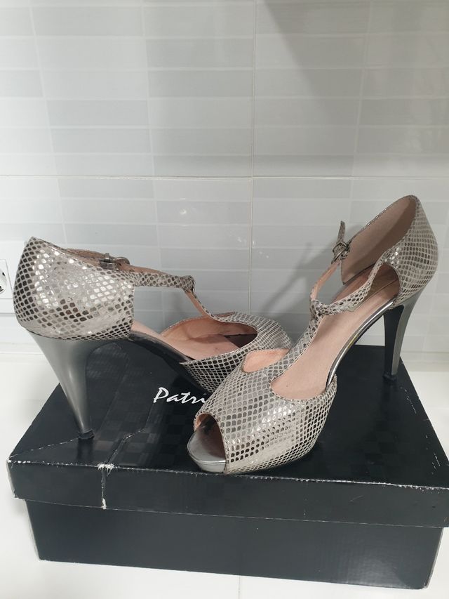 Sandalia tacón 10cm y plataforma delantera 2cm. Color cobre plata. Talla 40