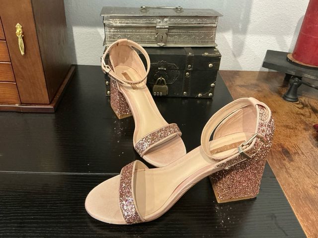 Sandalias Bershka tacón glitter rosa y dorado, 7cm