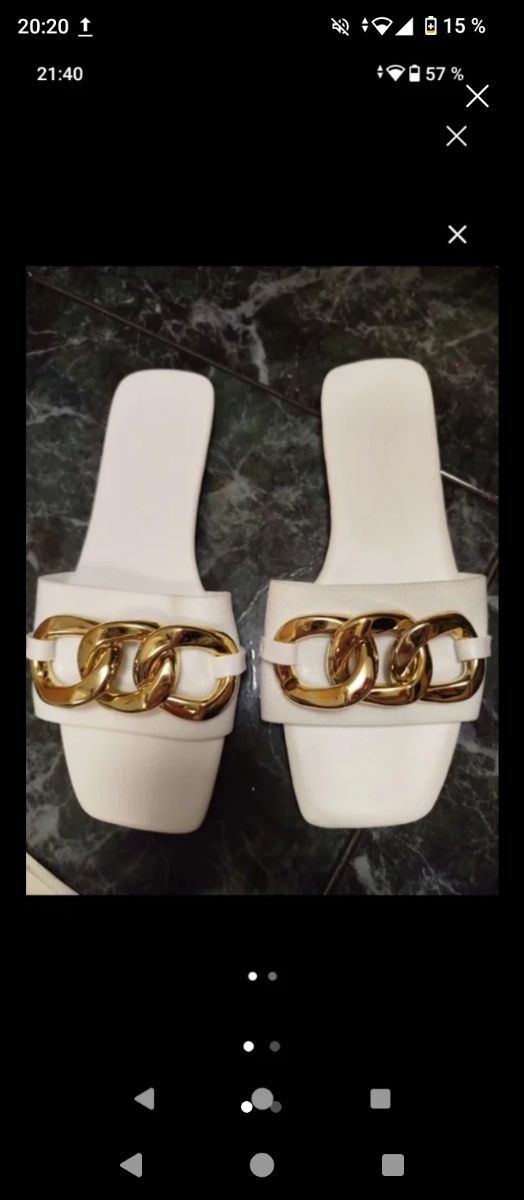 Sandalias planas de color blanco con un diseño moderno. - Tira ancha con detalle de eslabones dorados. - Punta cuadrada. Talla 39