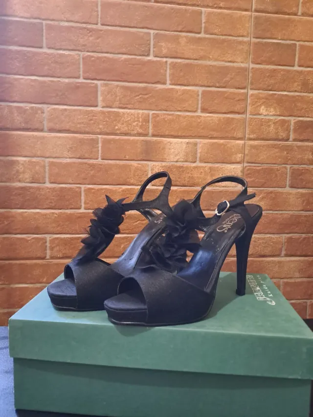 Elegantes sandalias de fiesta en color negro, perfectas para ocasiones especiales. Cuentan con un diseño de plataforma y tiras finas. Talla 38.
