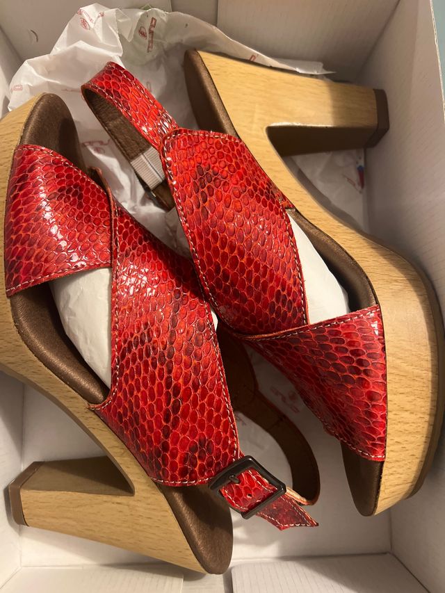 Sandalias de piel roja con tacón de madera