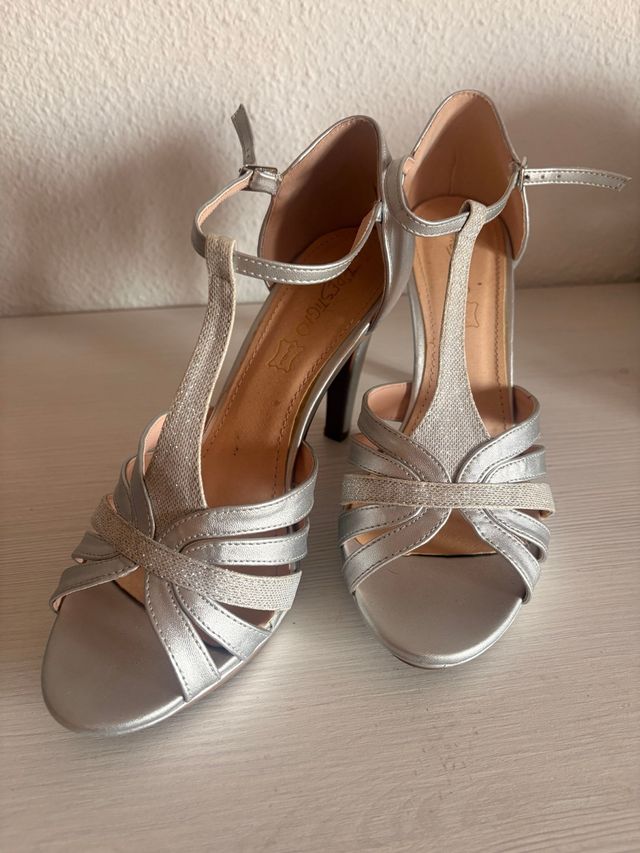 Sandalias de tacón elegantes en tono plateado, ideales para eventos o fiestas. Diseño con tiras cruzadas y cierre al tobillo que aporta sujeción y estilo. Cómodas y sofisticadas, perfectas para completar un look formal o de noche