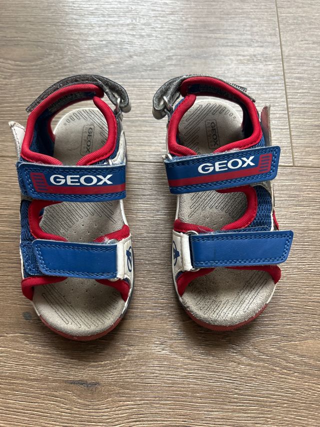 Sandalias Geox para niño en talla 26. Perfectas para el verano. - Cierre de velcro. - Diseño deportivo en azul, rojo y blanco. - Marca Geox visible en las tiras.