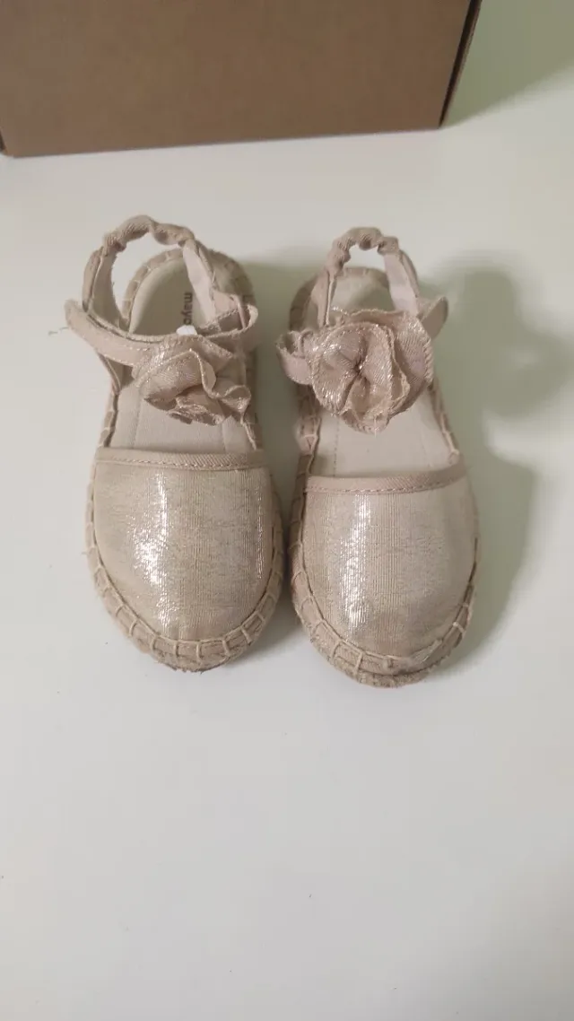 Sandalias de la marca Mayoral en talla 26. - Color beige con detalles brillantes. - Adorno de flor en la pala. - Cierre elástico en el talón. - Suela de esparto.