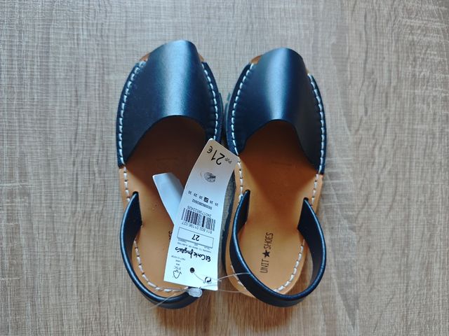 Detalles del productoSandalias infanyiles tipo menorquinas, talla 27, a estrenar. Son de color negro y tienen una suela de goma resistente. Ideales para el verano.
