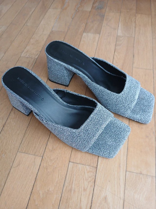 Estilosas sandalias de tacón cuadrado de 8 centímetros con un diseño de hilo plateado brillante.