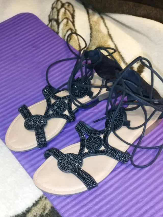 Sandalias romanas negras con pedrería y cordones