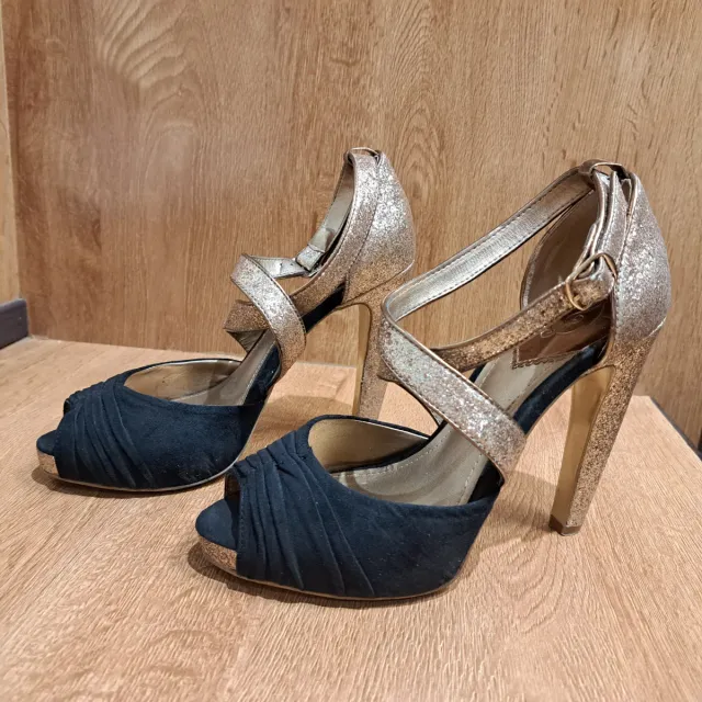 Sandalias Stradivarius tacón dorado y negro