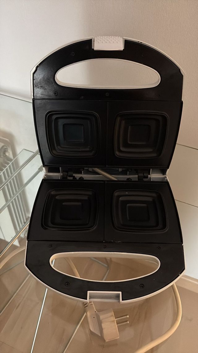 Sandwichera eléctrica con diseño moderno y compacto. - Placas antiadherentes. - Asa de tacto frío. - Indicador luminoso de encendido y listo.