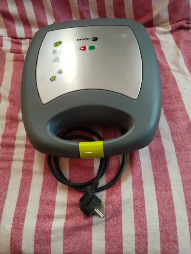 Detalles del productoSandwichera Fagor en color gris con detalles decorativos.