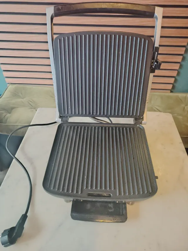 Detalles del productoSandwichera grill eléctrica con placas acanaladas para marcar tus bocadillos y carnes.
