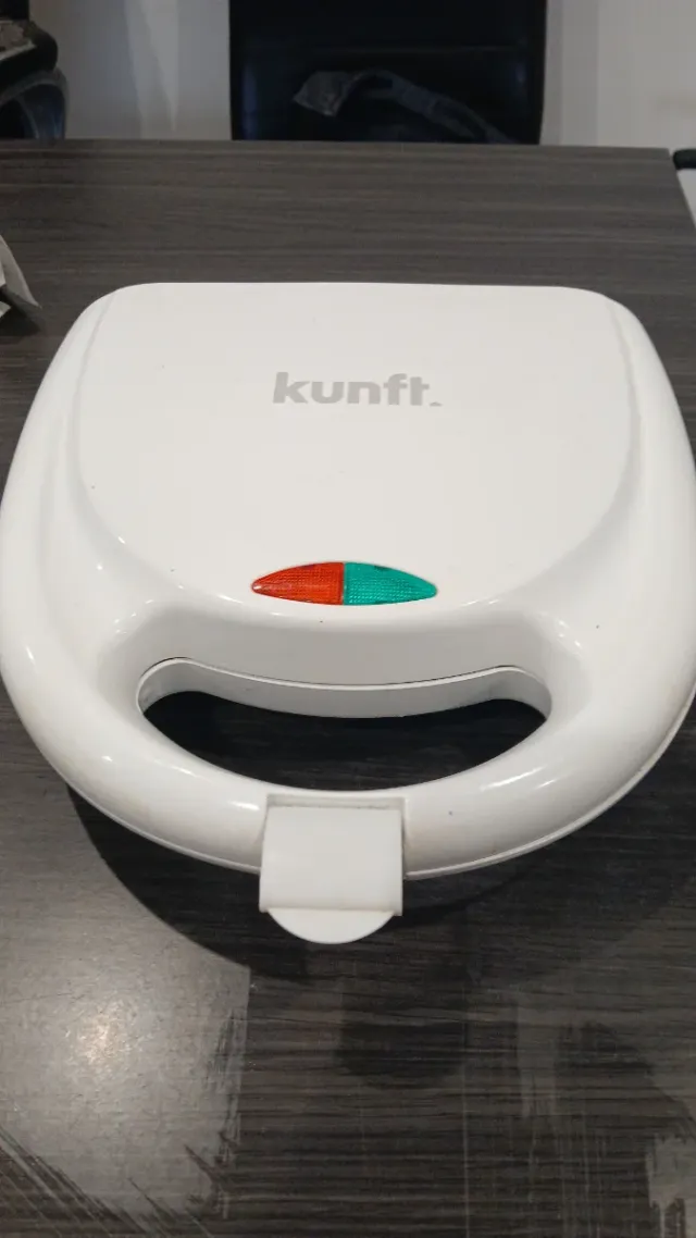 Sandwichera Kunft en excelente estado. - Color blanco. - Indicadores luminosos de encendido y listo.