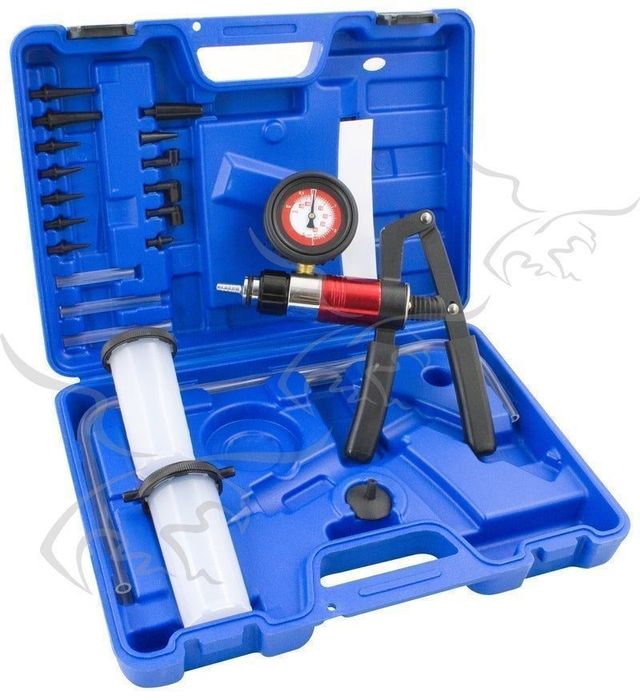 Detalles del productoComprobador sangrador purgador de frenos manual perfecto para la comprobación de presión y vacío. Este kit de sangrado incluye pistola para aspirar o soplar con manómetro (-26 a 40 Psi/-1 a 3 Bar), contenedores plásticos para fluidos, adaptadores y tuberías de purgado con diferentes longitudes. Este sangrador purgador de frenos o vacuómetro es válido para medir y purgar el aire del sistema de frenado, ajustes del carburador, extraer líquido del embrague, puesta a punto de la bomba de inyección
