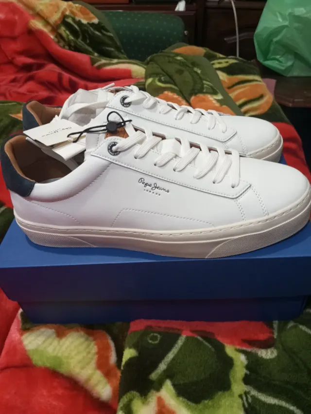 Zapatillas Pepe Jeans Yogi de piel blanca con detalles azules. - Zapatillas de piel blanca. - Detalles en azul. - Talla 46.