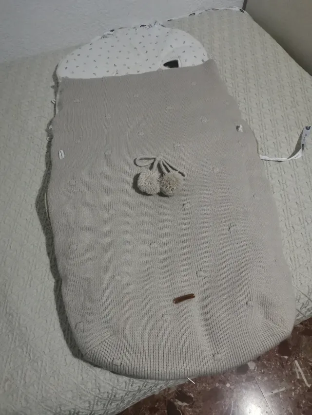 Detalles del productoSaquito de punto para silla de bebé, ideal para el invierno. Presenta un diseño con pequeños topos y dos pompones decorativos.
