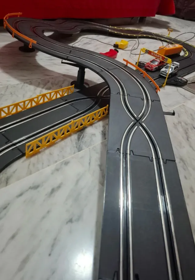 Circuito de carreras Scalextric. - Incluye coches, mandos y accesorios. - Pistas de competición, con 20 placas curvas y 8 placas rectas, 2 de ellas de cruce. - No incluye pilas.