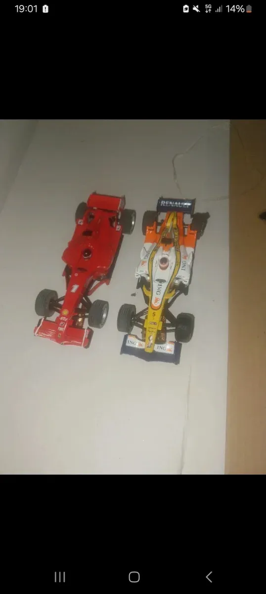 Dos coches de Scalextric de la temporada 2008. - Coche Ferrari rojo. - Coche Renault naranja y blanco.