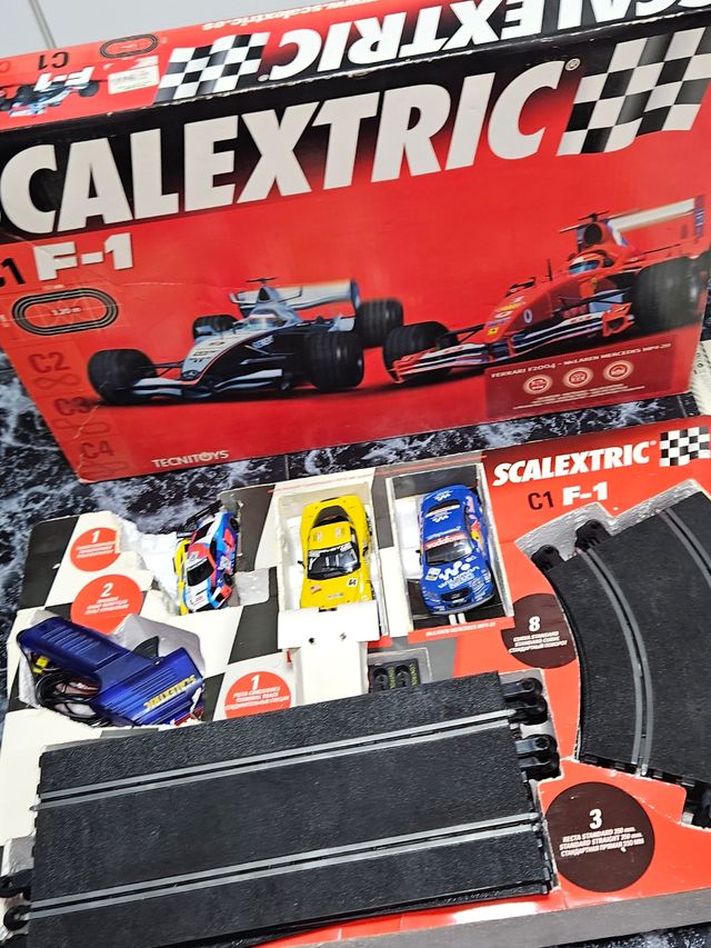 Detalles del productoScalextric C1 F1 en buen estado. Incluye 4 coches y circuito y dos mandos . Perfecto para principiantes. - 4 coches de carreras incluidos. Dos grandes y dos pequeños Circuito Scalextric C1 F1. - Ideal para principiantes.coches mandos , y cables originales .funciona perfectamente