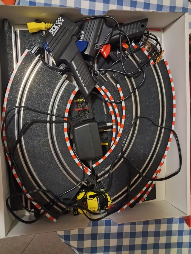 Detalles del productoCircuito de coches Scalextric con mandos y accesorios.