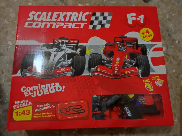 Circuito de carreras Scalextric Compact F-1. - Coches de Fórmula 1 a escala 1:43. - Mando con turbo. - Indicador de vueltas. - Fácil montaje y mayor resistencia.