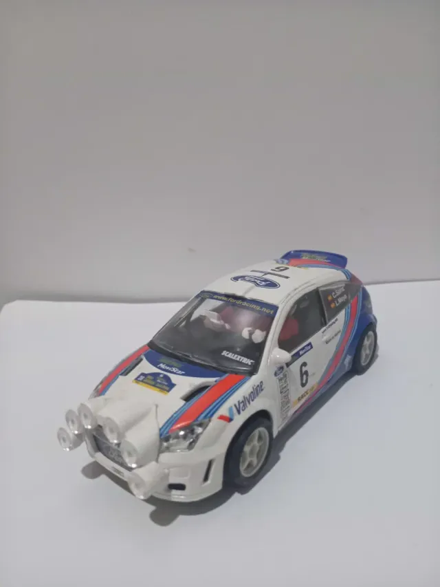 Detalles del productoCoche de Scalextric modelo Ford Focus de rally. Presenta un diseño deportivo con detalles de patrocinadores.