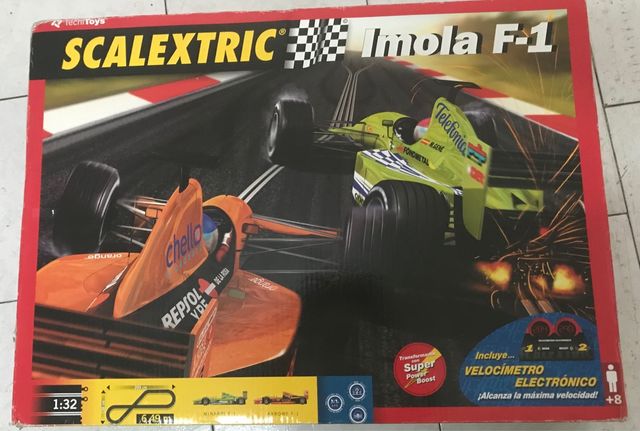Scalextric Imola F-1, con muy poco uso. Esta muy nuevo. De 6.9 m de longitud. Incluye dos formulas 1, velocímetro electrónico. Además incluyo dos coches nuevos también.